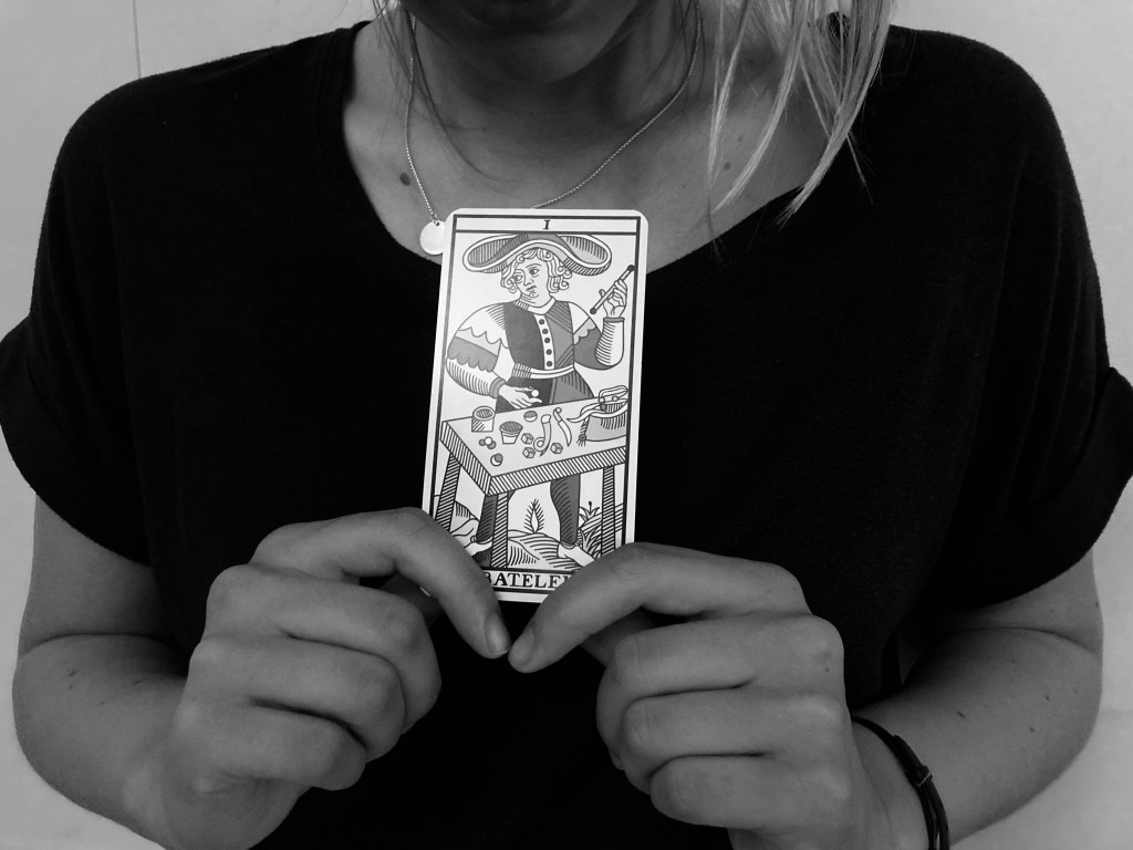 Vor Beginn der Performance betonen die drei, dass sie das Tarot nicht im klassischen Sinne als ein Mittel zum Voraussagen der Zukunft sehen oder verwenden wollen. Sie nutzen Tarot vielmehr „as a tool for and as the subject of the research“. Die Karten nehmen hier also eine zweifache Position ein: wird einerseits ihr Inhalt tänzerisch und gestalterisch interpretiert und untersucht, so legt dieser Prozess gleichzeitig auch den Weg in ein großes Unbekanntes frei, das dahinterliegt. Ein offener Raum, um assoziativ, spielerisch zu denken, der Schemenhaftes artikulierbar macht. Im Open Studio sind meine Begleitung und ich mit den drei Künstler:innen alleine. Da wir zu zweit gekommen sind, stellt nur sie eine Frage, welche sie, unsichtbar für den Rest von uns, auf ein Blatt Papier schreibt. Anschließend wird in gewohnter Manier eine Karte gezogen, dann breitet sich Stille im Raum aus. Alle fünf Augenpaare konzentrieren sich schweigend auf die aufgelegte Karte: „Le Bateleur“. Nach und nach erheben sich die Künstler:innen und folgen wie selbstverständlich einer inneren Idee, hinein in den geheimnisvollen Raum der Möglichkeiten.