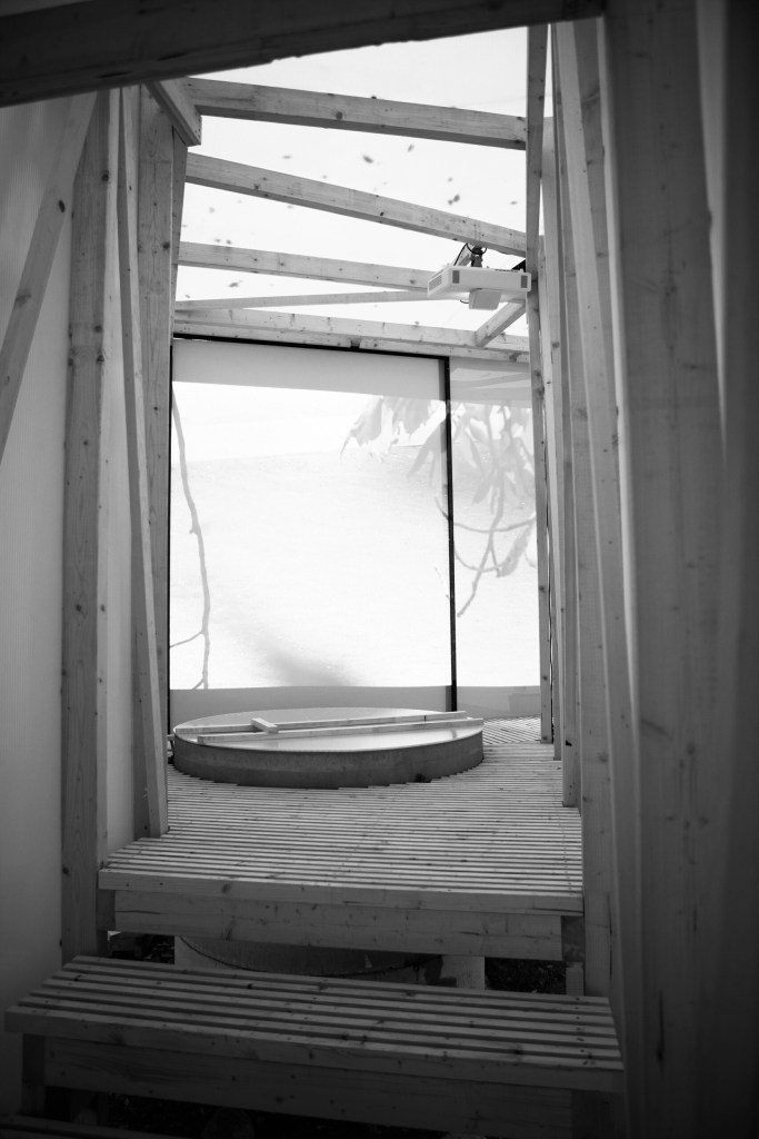 Martina: Yes, and that is exactly where the bathing comes in. The temperature of the water really slows down your circulation. You might have a guest who is very nervous and thinking “Oh no, I don’t want to do this” but as soon as they are in the tub, there is this switch moment, where you relax and your body temperature gets really high. And you have this projection in front of you, long slow footage of nature, like a spot of grass and then a bird passes by, and our hope is that inside a safe and calming place like a hot tub, you might be able to let go of certain things that may worry you or that you are attached to, and you get to enjoy the footage and take the time for it.