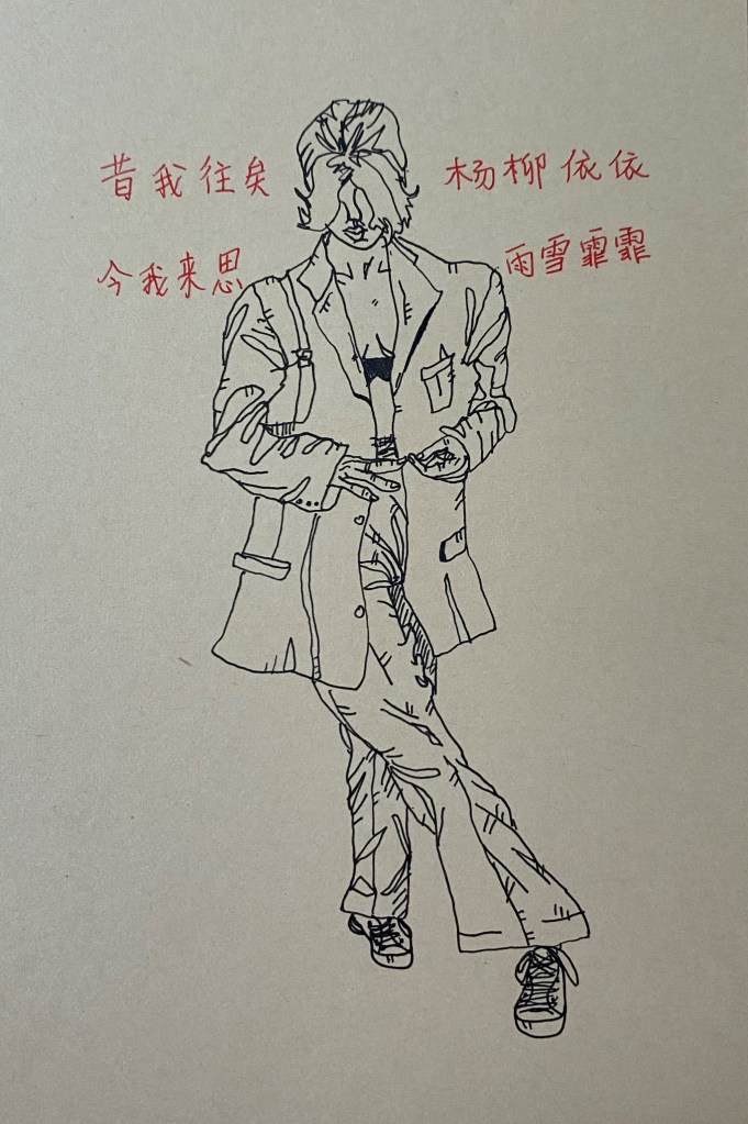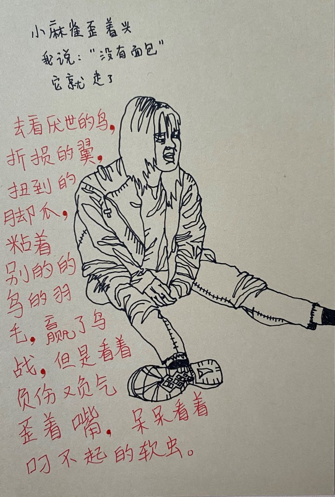 The work mostly consists of thin-black-line drawings. Next to the drawings, sometimes are dates or poetry. I want to capture everyday people in their most human moment. Using thin lines gives me precisions and the lines are also „awkward“ in an intentional way to portray the vividness of expression through the bodies, clothes or faces.
