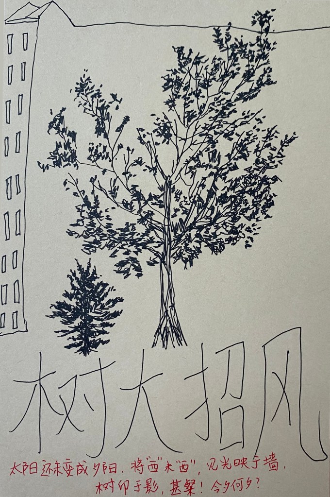 Text (red): The sun has not set, about to be “west” but not “dimmed” (in Chinese, „west“ and „dimmed“ sound the same). The light reflected on to the wall and the trees are printing its shadow, so splendid! What day is today? („today“ in Chinese sounds the same as „sunset“)