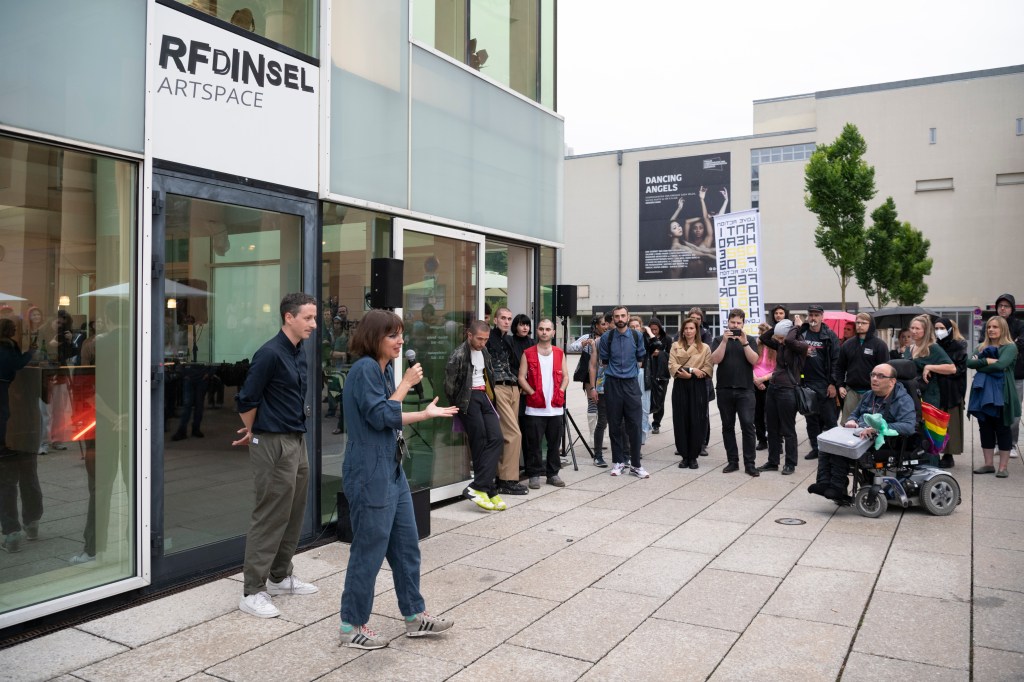 Während des Aufbaus treffe ich mich vor dem Kubus mit der Tiroler Künstlerin und Initiatorin des Projekts, Carmen Brucic. Wir begeben uns gleich in den etwas ruhigeren Hofgarten, wo sie mir ausführlich erzählen wird, was sie dazu bewegte, in die georgische Underground-Clubszene einzutauchen und deren Akteur:innen in ihren privaten Wohnräumen fotografisch zu portraitieren. Auf der Suche nach einer ruhigen Sitzbank begegnen wir einer Gruppe Jugendlicher, die sofort mit der Künstlerin in ein Gespräch einsteigt. „Das sind meine Schüler, ich bin auch Kunstlehrerin am Gymnasium“, klärt sie mich auf. Carmen Brucic weiß es, ihre Tätigkeiten miteinander zu verschränken. In ihrer künstlerischen Arbeit geht sie einen Dialog mit jungen Menschen ein und beschäftigt sich mit Fragen, Ängsten und Visionen, die diese Generation begleiten.