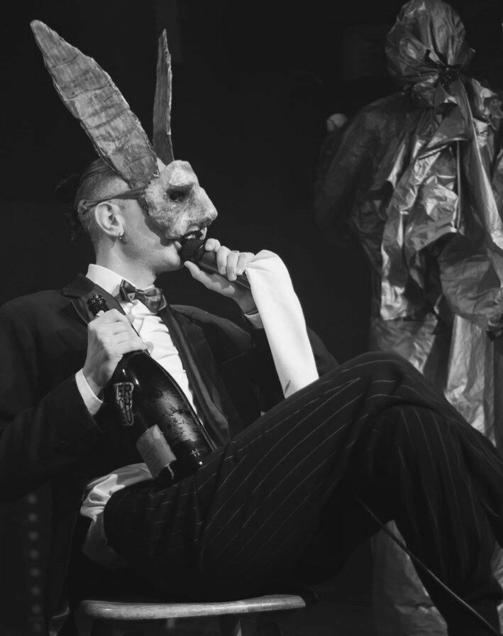 „Ich bin eine einzige Bedürfnispyramide“ wimmert er im nächsten Augenblick, während er von der zweiten Gestalt auf der Bühne in einem Akt irgendwo zwischen Fürsorge und Grausamkeit abwechselnd mit Zitronen und Sekt gefüttert wird. Der Täubling kriecht, bettelt und leidet demonstrativ, nur um im nächsten Moment wieder zu beleidigen, angebotene Zigaretten abzuweisen, nicht über wohlgemeinte Witze zu lachen, es kurzgesagt einfach völlig zu verweigern, irgendeine Form von versöhnlicher Artist-Publikum-Bindung einzugehen. Dazu ein ständiges Rotzen, Schlucken, Spucken in alle Richtungen, ein widerliches Gemisch aus jammervoll-röchelnden Geräuschen. Diese leeren Hasenaugen, eher Hasenlöcher eigentlich, verfolgen einen auch einfach überall hin, bis in die letzte Ecke des Raumes stieren sie einem hinterher.