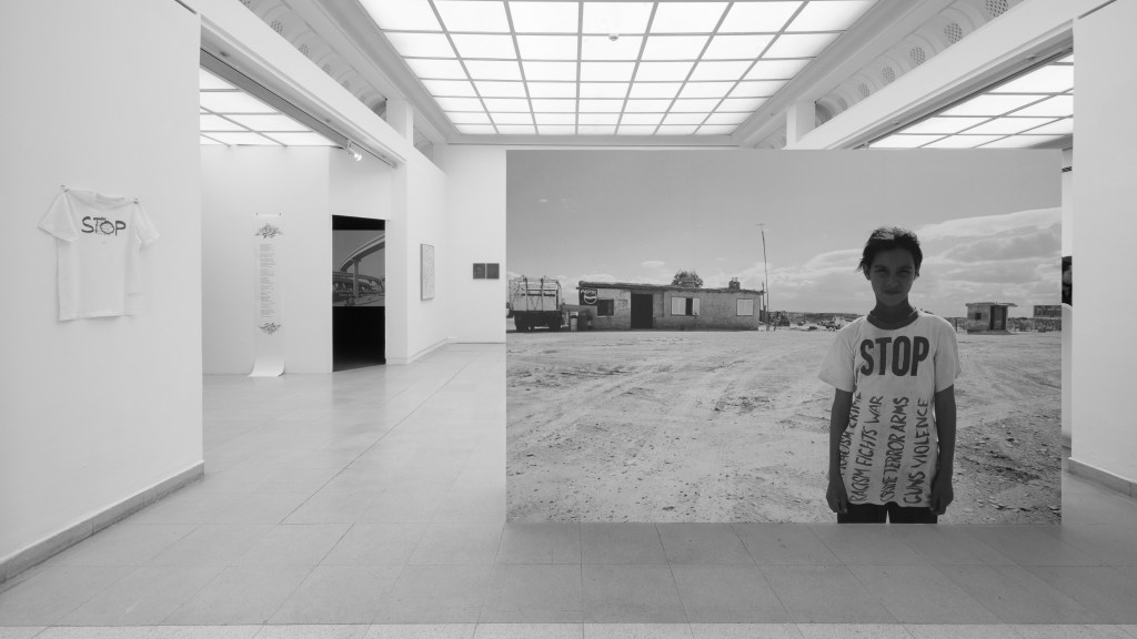 Angesichts der Breite der ausgestellten Positionen – sie kreisen von Feminismus, Diversity über Geschlechterdifferenz, sozialer Ungleichheit, globalen Wirtschaftsabhängigkeiten, Nahrungsnot Flucht und prekärer Existenz bis hin zum Tod – soll zunächst ein Werk Erwähnung finden, das durch seine de-platzierte Stellung auffällt: Eine groß angelegte Fotografie von Katharina Cibulka stellt sich unweit des Eingangs zum Kunstpavillon wie eine Absperrung in die Quere. Zu sehen ist in dieser im Zuge ihrer Weltreise 2004 entstandenen, snapshotartigen Momentaufnahme ein Junge vor einem argentinischen Café „in the middle of nowhere“ auf dessen Shirt in roten Lettern die Aufschrift STOP RACISM, FIGHTS, WAR, CRIME, TERROR, ARMS, GUNS, VIOLENCE prangt. Der Mut des Kindes, sich der Ungerechtigkeit symbolisch in den Weg zu stellen, zeugt von einem verlorengegangenen Optimismus, der teils nur mehr in der kindlichen Naivität fortzuleben scheint und etwas Aktivistisches hat. Er bildet einen Kontrast zu seiner nachdenklichen, ernsten Miene, sprich zu dem unverblümten Blick in die Realität. Mit dem Jungen können sich Besucher:innen im wahrsten Sinne des Wortes solidarisieren: Käuflich erwerbbare T-Shirts mit ergänzten und wiederholten Begriffspaaren sollen die Botschaft in die Öffentlichkeit tragen. STOP SEXISM, DIVISION, HUMILIATION können sie unter anderem an ihrem Leibe spüren, werden zu Träger humaner Werte. Nicht nur hier setzt „Ecologies of Care“ Akzente, die über die Räume der Ausstellung selbst hinausreichen. Ein Verhaften in den Innenräumen wäre in Anbetracht der gesellschaftlichen Problematik, die „Care“ mit sich bringt, wohl auch zu wenig. Der Ausstellung bleibt nichts anderes übrig, als den Schritt nach draußen zu gehen, sei es gedanklich wie auch künstlerisch-ästhetisch.