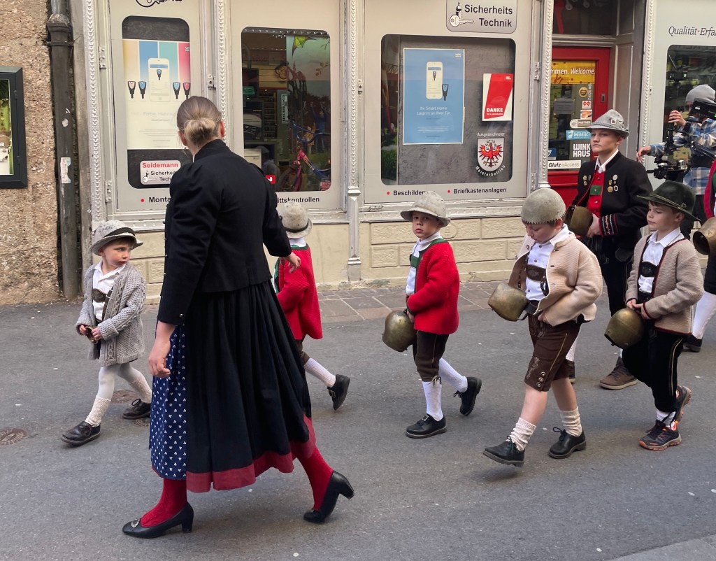 Als wir nach dem Gespräch das Cafè La pausa verlassen, ertönen rechts von uns traditionelle Klänge und bald marschiert eine kleine Trachtengruppe, hauptsächlich Kinder mit umgehängten Kuhglocken, durch die Kiebachgasse: