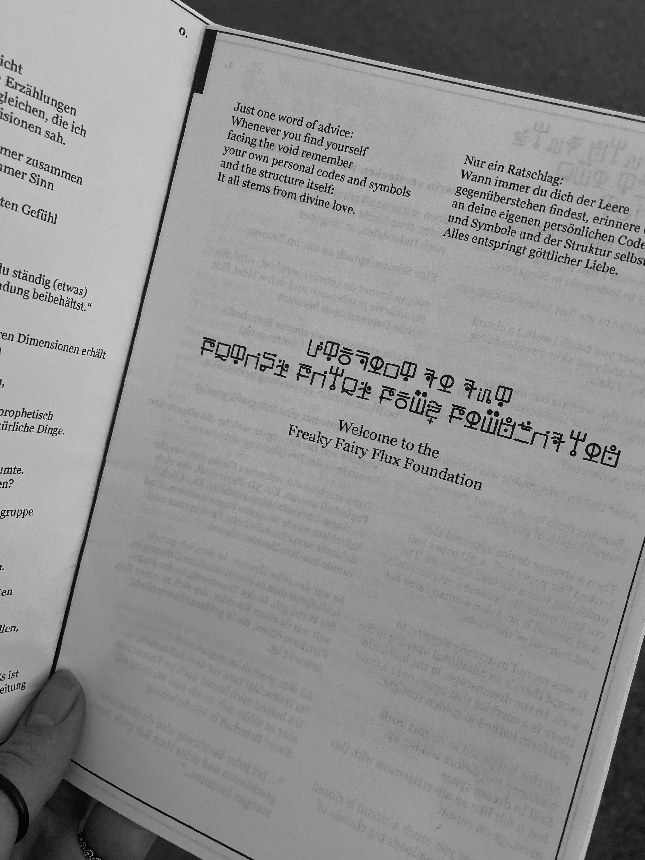 Auf der Eingangstüre des gläsernen Kubus Reich für die Insel sind dieser Tage vier mysteriöse Schriftzeichen, in vertikaler Anordnung platziert, zu sehen. So manche Besucher:innen haben sich bereits gewundert, was es mit diesen Symbolen auf sich hat. Die vier Zeichen stehen abgekürzt für den Namen des Projekts FREAKY FAIRY FLUX FOUNDATION (FFFF) – wofür Karin Ferrari eine eigene Schrift kreierte.