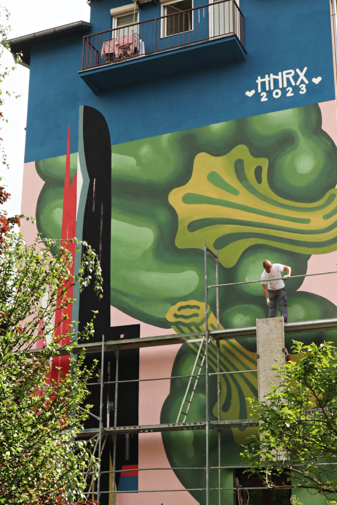 HNRX: Das erste Mal organisiert haben wir das Festival 2018, in Innsbruck beim Westbahnhof unter der Autobahn. Da hatten wir fünf Künstler:innen und fünf zu bemalende Säulen im Programm und dazu noch eine Gruppenausstellung. Seit 2021 gibt es ein neues Team, das unter anderem aus meinem Freund Julian Hackl und aus Melanie Gantyra besteht. Melanie ist Graphikerin und hat sehr ähnliche visuelle Vorstellungen von Ästhetik, wie ich sie habe und so haben wir 2021 einen Neustart hingelegt. Es ist ein Verein, der aus mehreren Menschen besteht – Melanie und ich sind aber aktuell diejenigen, die das Geschehen voranbringen, die künstlerische Leitung übernehmen und auch entscheiden, wer beteiligt ist.