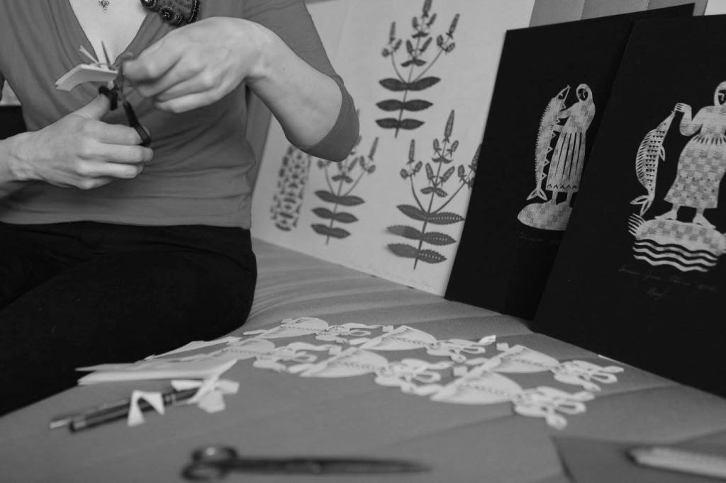 Zwei Frauen haben sich in paradiesischer Umgebung auf pflanzenartigen Stühlen um einen Wipptisch gemütlich gemacht. Nicht zuletzt werden traditionelle Muster aufgegriffen und mit neuer Bedeutung aufgeladen. In diesem Zusammenhang sollte neben der Tradition der sogenannten Vycinanka, einem der in der lokalen belarussischen Bevölkerung weit verbreiteten, zur Dekoration von Häusern verwendeten Verfahren auf das jüdische Scherenschnittverfahren hingewiesen werden. Letzteres ist eine in Belarus verbreitete Methode, Papierrahmen für wichtige Dokumente in religiöser Manier auszugestalten und herauszuheben. Querverbindungen zur Rolle des Scherenschnittes auch in Österreich und Westeuropa poppen auf. Er kam schließlich, ähnlich wie in Belarus, in herausfordernden Zeiten als Kunsthandwerk zum Tragen, um als Kontradiktion die Schönheit der Welt heraufzubeschwören. Man denke nur an Anna de Wall, Hedwig Goller, Josefine Allmayer sowie Otto Böhler oder Henri Matisse. Zudem liegt im Scherenschnitt auch hier bereits ein subversives Moment verborgen: Er suggeriert auf den ersten Blick private Häuslichkeit, wurde mitunter im 18. und 19. Jahrhundert von Frauen als Kunsthandwerk entdeckt, um sich für sie verschlossene Räume zur bildenden Kunst zu öffnen und so gewissermaßen verdeckt Gesellschaftskritik auszuüben. Ein Paradebeispiel hierfür war die 1776 geborene Luise Duttenhofer. War es in dieser Zeit für Frauen fast unmöglich den Beruf einer Künstlerin nachzugehen, gestand man ihnen als eine der wenigen künstlerischen Aktivitäten das Scherenschneiden als Freizeitaktivität zu. Bei genauerem Hinsehen ist und war der Paper-Cut daher immer schon mehr als eine Freizeitbeschäftigung.