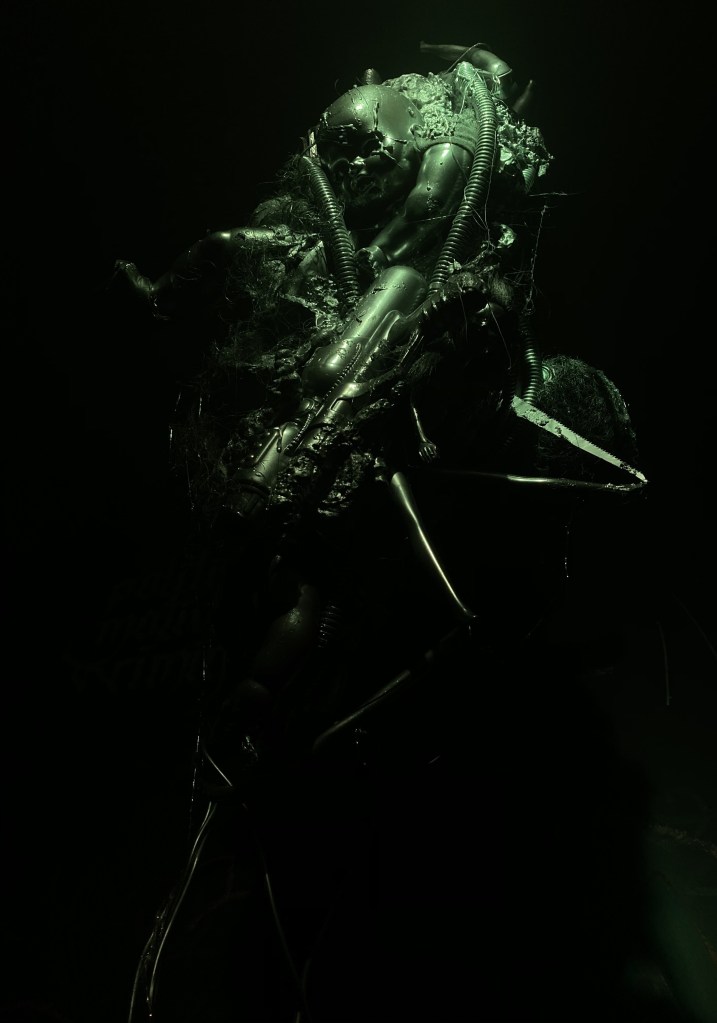 Eine feministische Analyse des Films könnte vermutlich in verschiedene Richtungen ausfallen. „I mean, the scariest thing the men who wrote ALIEN could think of was a living thing taking up residence in your torso, then bursting out of you.“ kommentiert die Schriftstellerin Olivia Campbell trocken auf Twitter. Manche Theorien zum Film behaupten, Drehbuchautor Dan O‘Bannon hätte sich das Genre des Body Horror bewusst zunutze gemacht, um die Männer im Publikum einer ihnen bisher unbekannten Art von Unbehagen in Bezug auf ihre eigenen Körper auszusetzen. Die Parallelen zu einer ungewollten Schwangerschaft sind trotz aller Horror- und Sci-Fi-Elemente jedenfalls nicht von der Hand zu weisen. Nach dem Filmscreening treffen wir in der p.m.k auf eine extra für Aural Visions entstandene Installation der Künstlerin Mirjam Miller, die Puppenkörperteile und Plastikwaffen zu einem grotesken Klumpen verschmolz, welcher im Durchgangsbereich von der Decke baumelt. Eine zugehörige Soundinstallation pumpt pulsierende Geräusche durch die Toilettenräume, bedrohlich schimmern die Augen des grünlichen Säuglings im Zwielicht und verfolgen uns Richtung Konzert – das Wesen in dir ist nicht nur parasitär, es ist auch noch bewaffnet.