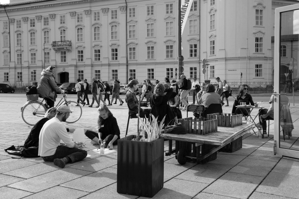 Das 5. und letzte Modul des Lehrgangs begleitet die Designerin Alexandra Fruhstorfer. Schauplatz ist der Kubus „Reich für die Insel“ am Platz vor dem Landestheater in strahlendem Sonnenschein Ende Oktober. Bevor es losgeht, holen die Klimakultur-Organisatorinnen noch einen „Pflanzshuttle“ ab, der eigentlich vor der Bäckerei steht und Pflanzen beheimatet, gleichzeitig aber auch Räder hat und daher als Mobil dienen soll und im Laufe des Tages noch sehr viele unterschiedliche Funktionen erhalten soll.