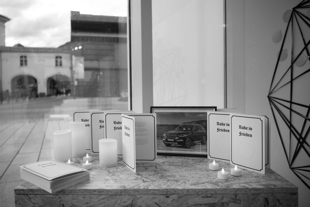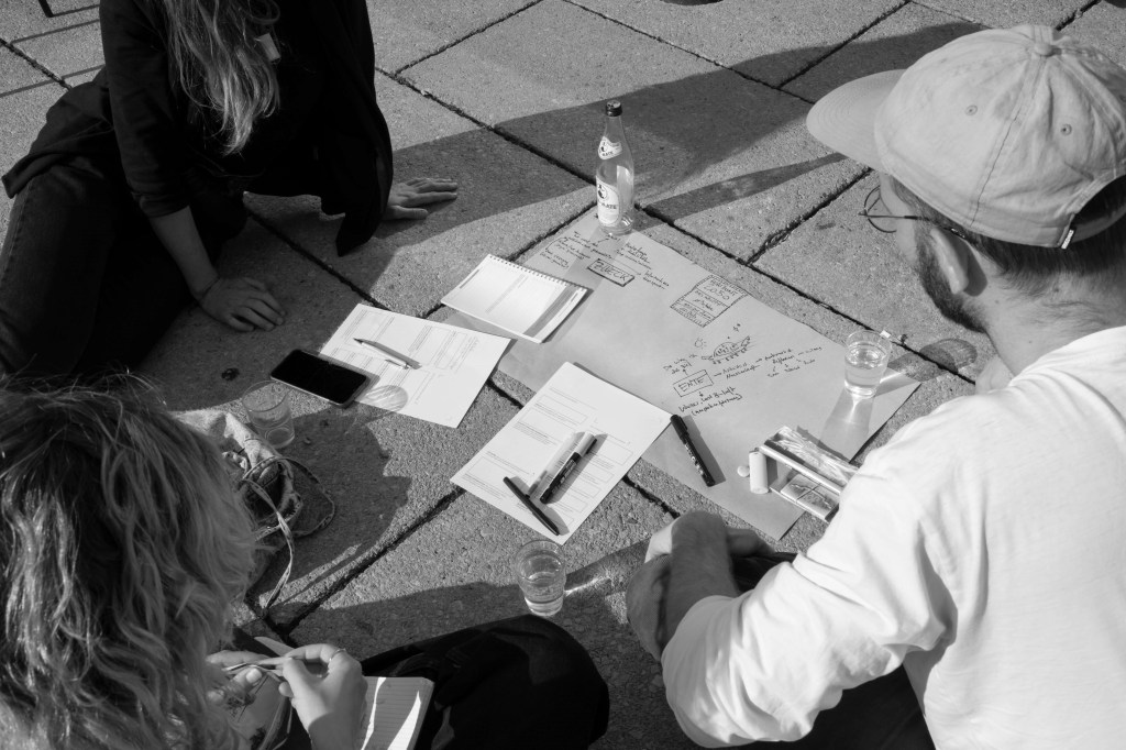 Der Lehrgang geht in den Abendstunden schließlich in den 4. Treffpunkt Klimakultur über. In der Zwischenzeit haben auch die Klimakultur-Organisatorinnen – Barbara Alt, Stephanie Rauscher und Anna Perktold – ganze Arbeit geleistet und das Reich für die Insel in einen Ausstellungsraum umgestaltet. Die „Vision Innsbruck 2035“ wird mittels Bannern dem Publikum nähergebracht. Unterschiedliche Stationen zeigen die erarbeiteten Werke: die Nachrufe wurden ausgedruckt und erhielten einen Schrein, die Liebesbriefe erhalten eine eigene Liebes-Ecke, die Mobile sind publikumswirksam ausgestellt. Daneben sind die Besucher:innen selbst dazu angehalten, ihre eigenen Gedanken zu Papier zu bringen, selbst Nachrufe und Liebesbriefe zu schreiben. Darüber hinaus wurde von Jan Kamensky eine Visual Utopia zum Marktplatz erstellt: frei von jeglichen Objekten mit reichlich Platz, der eigenen Vision Gestalt zu verleihen. Die Bastelmaterialien lagen wieder bereit, der freie Marktplatz daneben ausgedruckt und bereit, gefüllt zu werden.