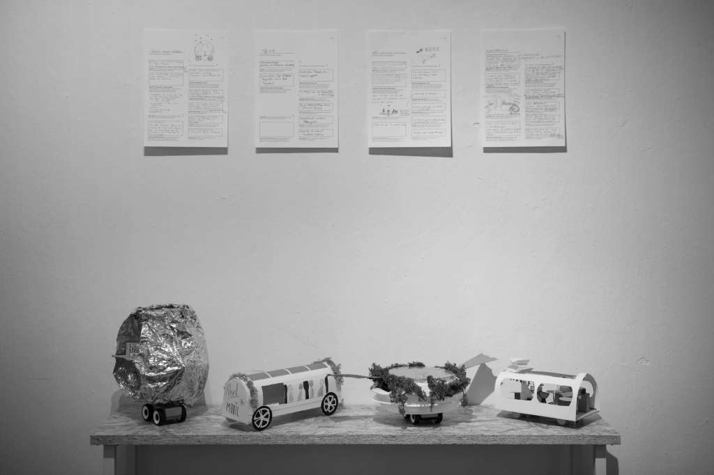 Im Rahmen ihres Vortrags stellt Fruhstorfer eine Sammlung mehr oder weniger ernst gemeinter Mobilitätskonzepte vor: etwa das Gehzeug von Hermann Knoflacher oder das Cabriobeet von Christoph Schwarz. Es soll um die Inspiration gehen, die Kreativität, Innovation, um das Anders-Denken. Dann geht es sogleich in die Konzeption: Wie sollen unsere Mobile der Zukunft aussehen? Welche Funktion haben sie, welche Ausstattung, wie werden sie angetrieben? Mit den Überlegungen aus den Arbeitsaufgaben ausgestattet kann es gleich in die Planungsphase gehen. Wilde Theorien werden durcheinandergeworfen, unterschiedliche Aspekte priorisiert und verschiedene Verwendungszwecke festgelegt. Als die Köpfe schon zu rauchen beginnen, geht es zum nächsten Schritt über: Wir werden mit einem Arsenal an Bastelutensilien ausgestattet und können unserer Vision nun eine Form verleihen. Gar nicht so einfach für Menschen, die sonst nicht mit solchen plastischen Modellen zu tun haben. Nach und nach bekommen die Vehikel eine Gestalt. Das Ergebnis kann sich sehen lassen. Die „Safe Space Bubble“ kommt mit einem futuristischen Glanzdesign daher und besticht durch ihre Funktion, Menschen nachts sicher nach Hause zu bringen und eine angst- und gewaltfreie Atmosphäre zu schaffen. Die „E.N.T.E“ (echt nützliche Tanzenergie) ist nicht nur Verkehrsmittel sondern auch Partymobil und wird durch die Bewegungen der Tänzer:innen sogar angetrieben. Im „Kaffeetomobile“ werden Transport und Kaffeekränzchen kombiniert: ein gemeinschaftlicher Ort, der zum Plaudern und Verweilen einlädt – und der Kaffeedampf sorgt noch dazu für den Antrieb. Das „Pool Mobil“ soll eine Schnittstelle zwischen individuellen Beförderungswünschen und öffentlichem Verkehr bilden: Anhand einer App buchen Mitreisende Fahrten und können so zum nächsten Knotenpunkt gelangen. Photovoltaik-Anlagen sorgen für die nötige Energie und der namensgebende Pool lädt zum Entspannen ein.
