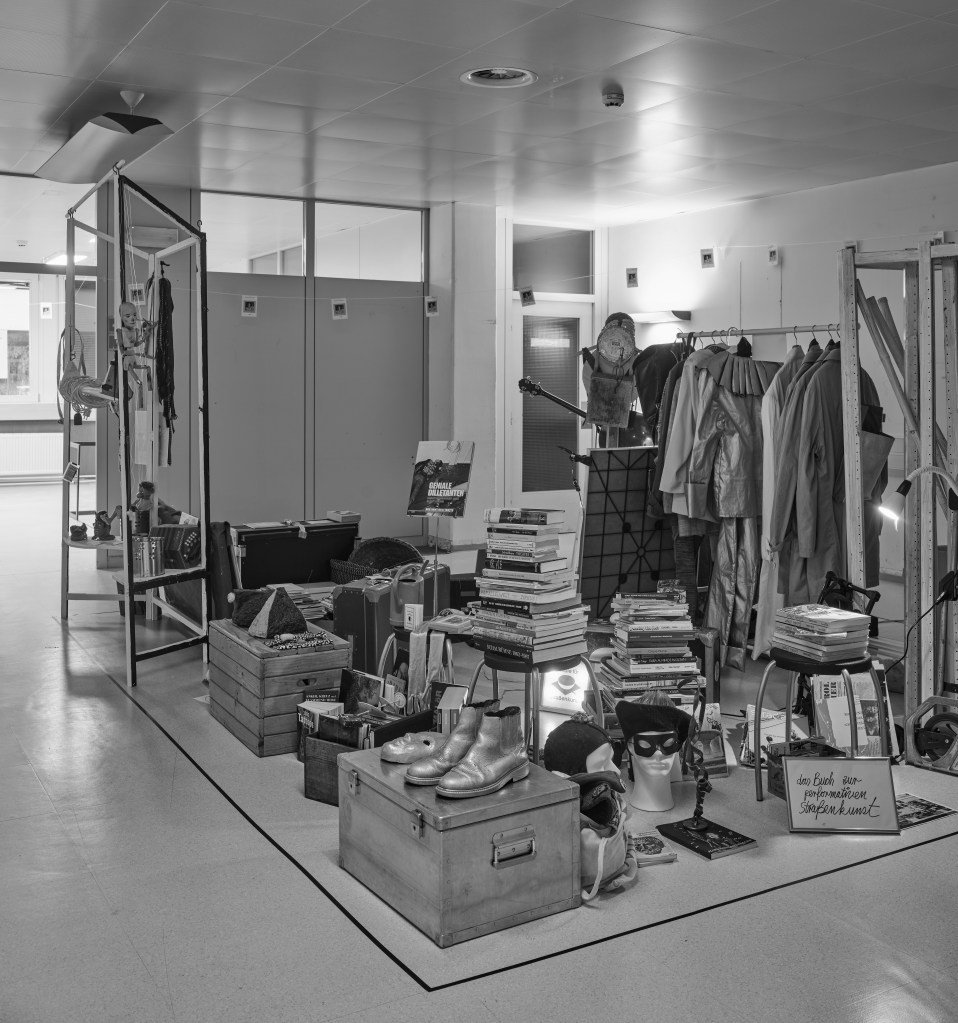 Im MOHO gruppierten sich also ausgehend von einem mit Zabels Geburtsjahr versehenen alten Tisch herum sich also auf mehreren Räumlichkeiten verteilt Objekte, die wie einzelne Lebensstationen des Künstlers wirken und doch miteinander verwoben sind: Requisiten aus dem Puppentheater, Masken, Gewänder, Körbe, Koffer, Kisten, Taschen, Gemälde, eine Gitarre, eine Harmonika sind dabei, rundherum stapeln sich Publikationen. Selbst eine Gießkanne ist in diesem Wirrwarr an Gegenständen auszumachen, wo einzelnes aus der Menge heraussticht, anderes untergeht. Es liegt im Auge des Betrachters, was man aufschnappt: So manche:r wird an der von Fäden herabhängenden Puppe mit Clownsgesicht hängen bleiben, andere bei der Venezianischen Faschingsmaske oder dem auf einem Pult stehenden Buch „Geniale Dilettanten“. Man erkennt einen Kabelsalat, der metaphorisch für dieses Gewusel steht, das ganz im Sinne Zabels entknotet werden muss – um sich selbst gewahr zu werden, wo man steht. Jede:r hat es im Alltag schon erlebt: Manchmal bleiben Dinge liegen, manchmal verstauben Gegenstände im Eck oder in der Schublade, dann wiederum werden sie wieder hervorgekramt. Manchmal wird einem Ding neue Bedeutung verliehen. Tom Zabel hat aus seiner Marionette mal aus aktuellem Anlass einen Weihnachtsmann gebastelt – vielleicht ist es eine banale Anekdote oder nette Metapher, im Falle von Trilogy of Change zeigt es gut, um was es Tom Zabel geht. Die Marionette konnte man in der Ausstellung sehen, wieder in der ursprünglichen Form. Ganz so verschieben sich die Bedeutungen des Lebens.
