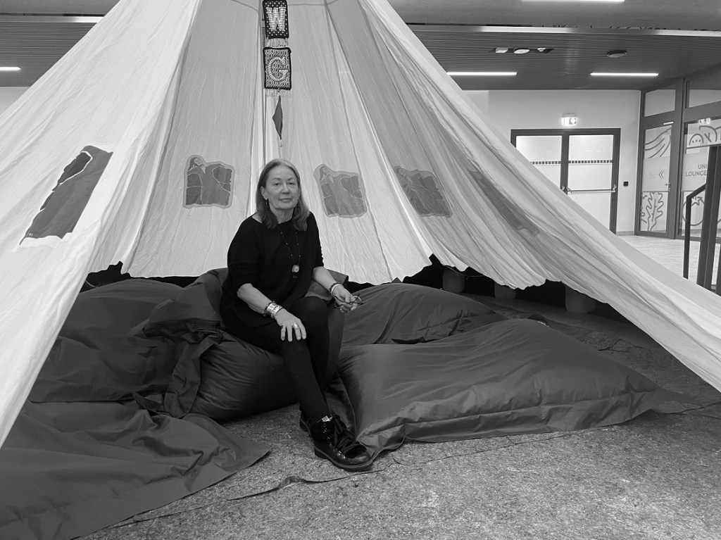 Wer am 28. und 29. November durch den Eingang des Ágnes-Heller-Hauses trat, dem bot sich ein besonderer Anblick: Im Foyer des frisch eröffneten Universitätsgebäudes thronte ein ausladendes Tipi mit roten Aufdrucken, befestigt an einer Figur, die oberhalb davon zu schweben schien. Rundherum verteilt waren große Sitzkissen, Liegestühle und Stehtische platziert. Ein einladender Ort zum Verweilen – aber auch einer, mit dem die Künstlerin Heather Carroll auf eine düstere Geschichte aufmerksam machen will. Das komplex hat die Künstlerin getroffen.
