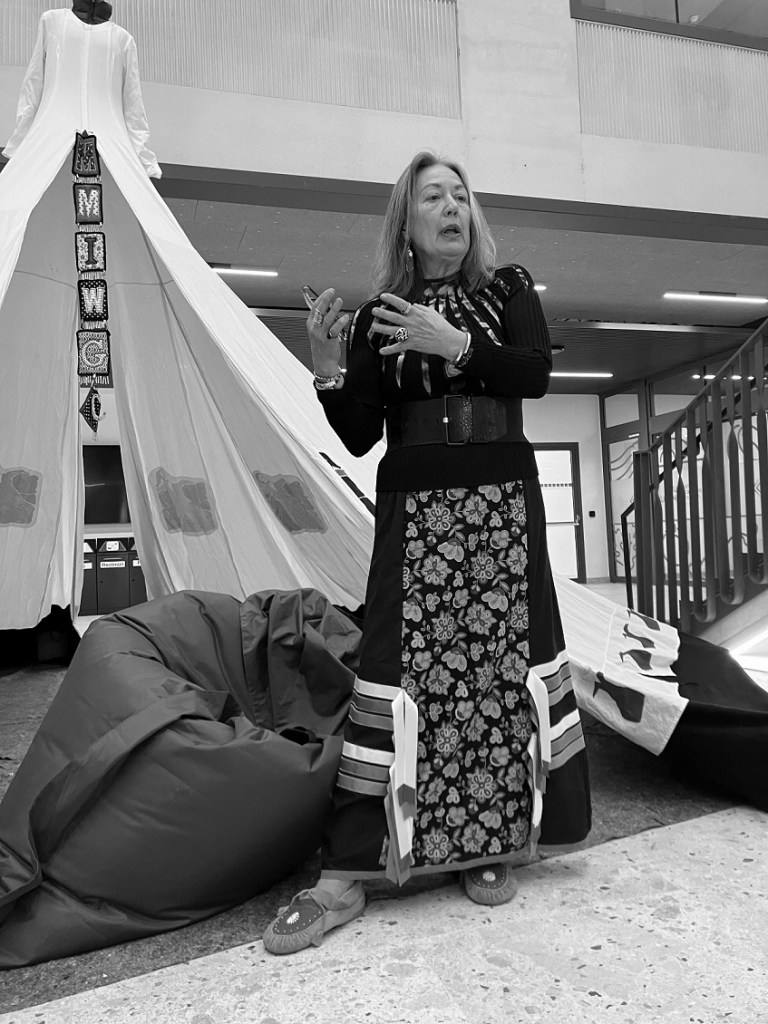 Mit diesen Hintergründen im Kopf können wir uns nun den Worten von Heather Carroll widmen. Die Künstlerin wurde als Tochter einer Inuit und eines Schotten in Labrador geboren. Sie ist eine Kablunangajuk, so werden Kanadier:innen genannt, die sowohl Inuit- als auch Nicht-Inuit-Wurzeln haben. Seit über 30 Jahren lebt sie in Luxemburg. Gemeinsam mit der Organisatorin Doris Eibl (Universität Innsbruck) sprachen wir über das Projekt, über das öffentliche Bewusstsein in Österreich und Kanada zu Kolonialismus und der Situation Indigener in Nordamerika und ihre jährlichen Besuche in Kanada, um ihre vielen Freund:innen „out West“ zu besuchen.