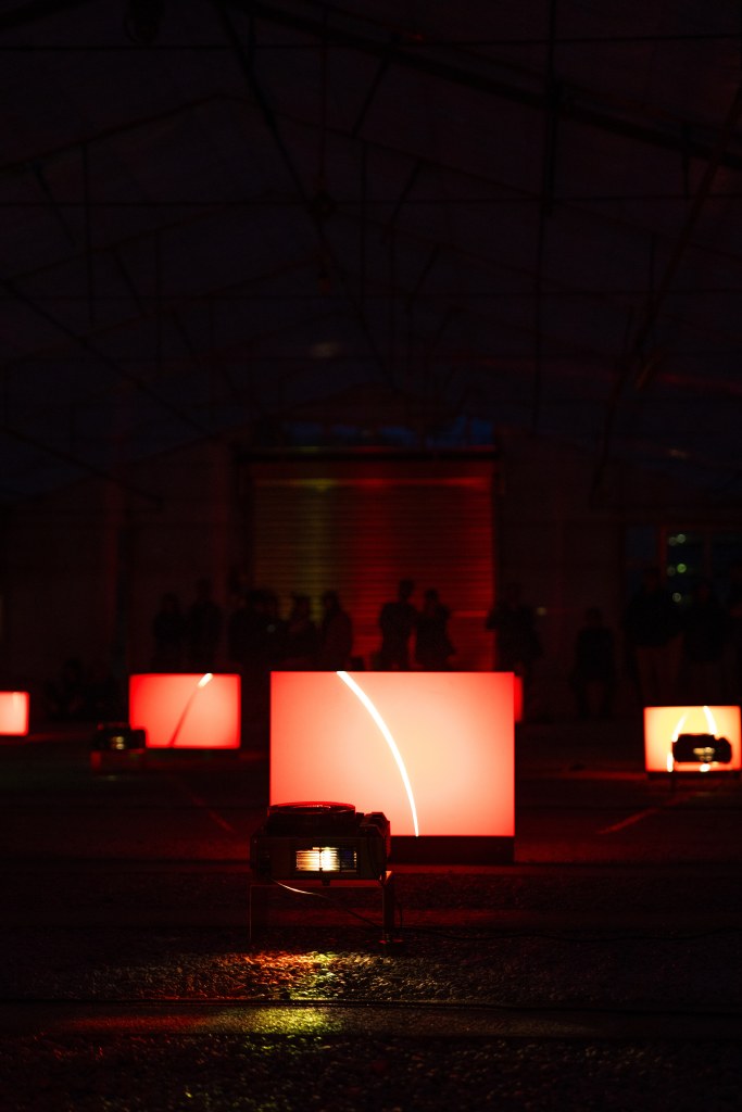 Am letzten Wochenende der Biennale ist in einem leeren Gewächshaus nahe dem Hofgarten „One. Two. Nine.“ von Philipp Fleischmann zu sehen. Im Programm war die Arbeit als „Performance“ angekündigt. Entsprechend verwirrt wandern die Besucher:innen durch die kleinteilige Klang- und Lichtinstallation. Mit Overhead-Projektoren, die ratternd verschiedene Bilder auf Plexiglaswände werfen, erleben wir den Sonnenuntergang durch die Glasfassaden. Dazu erklingen gelegentlich Tonsegmente, die auf mich relativ beliebig wirken. Erneut ist die Biennale aber mit kluger Kombination, mit dem Erschließen eines besonderen Ortes für eine besondere Stimmung erfolgreich: während die bunten Rechtecke im Kontrast zur sich langsam ausbreitenden Dunkelheit immer intensiver werden, herrscht eine Stunde lang eine eigentümliche Stille im Glashaus, wir verlassen die Gärtnerei schweigend und friedlich.