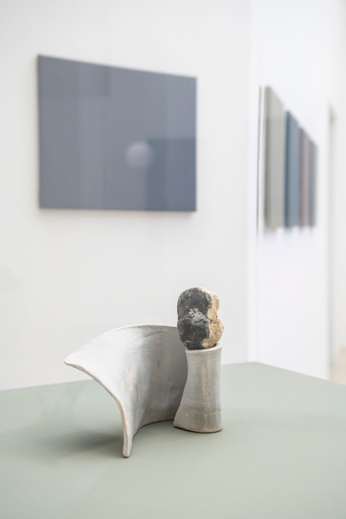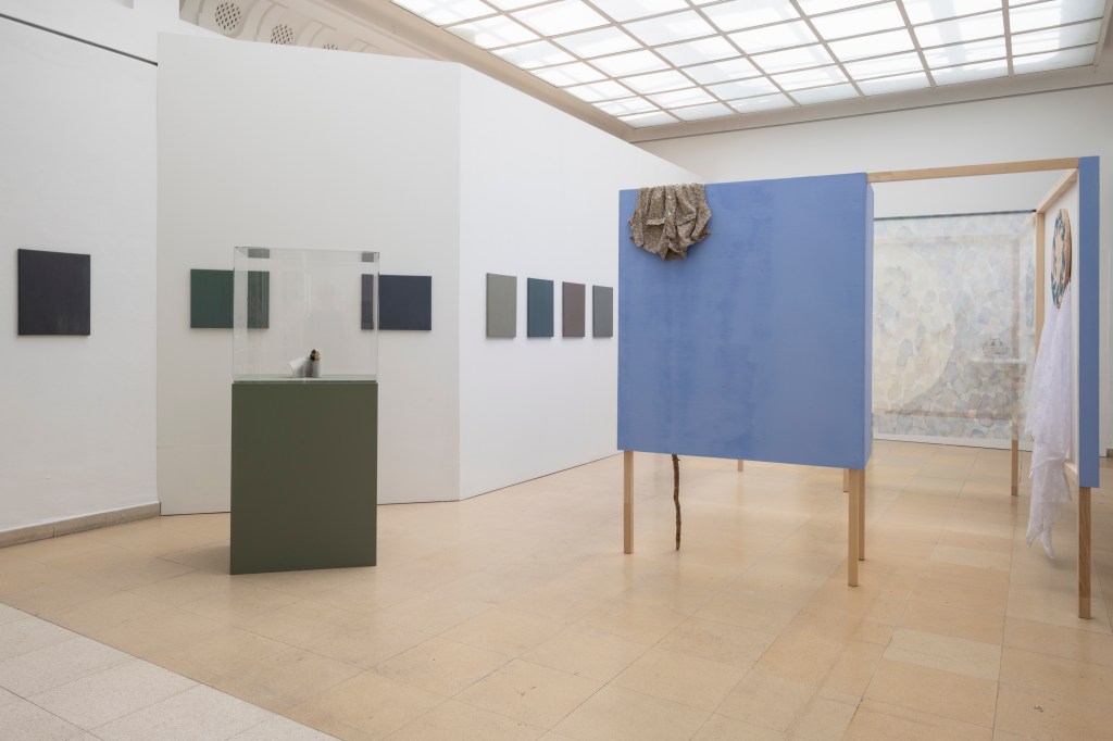 I found it interesting how you combine the urban socialist elements and the rural folk elements in your work. Apart from the colour blue, you work a lot with shades of grey, which obviously goes back to socialist modernist architecture – I’m thinking especially of the paintings on the wall outside the changing room…