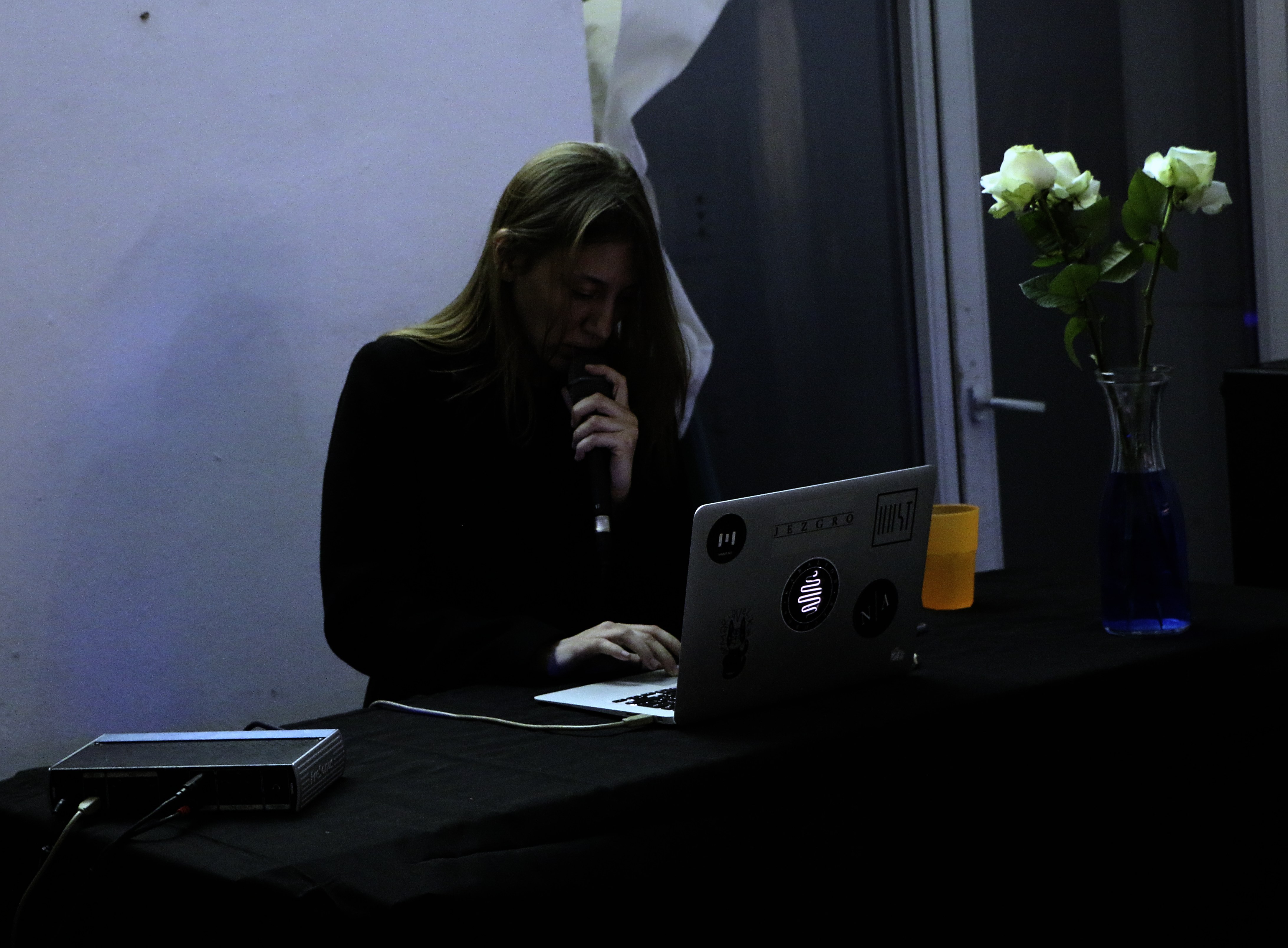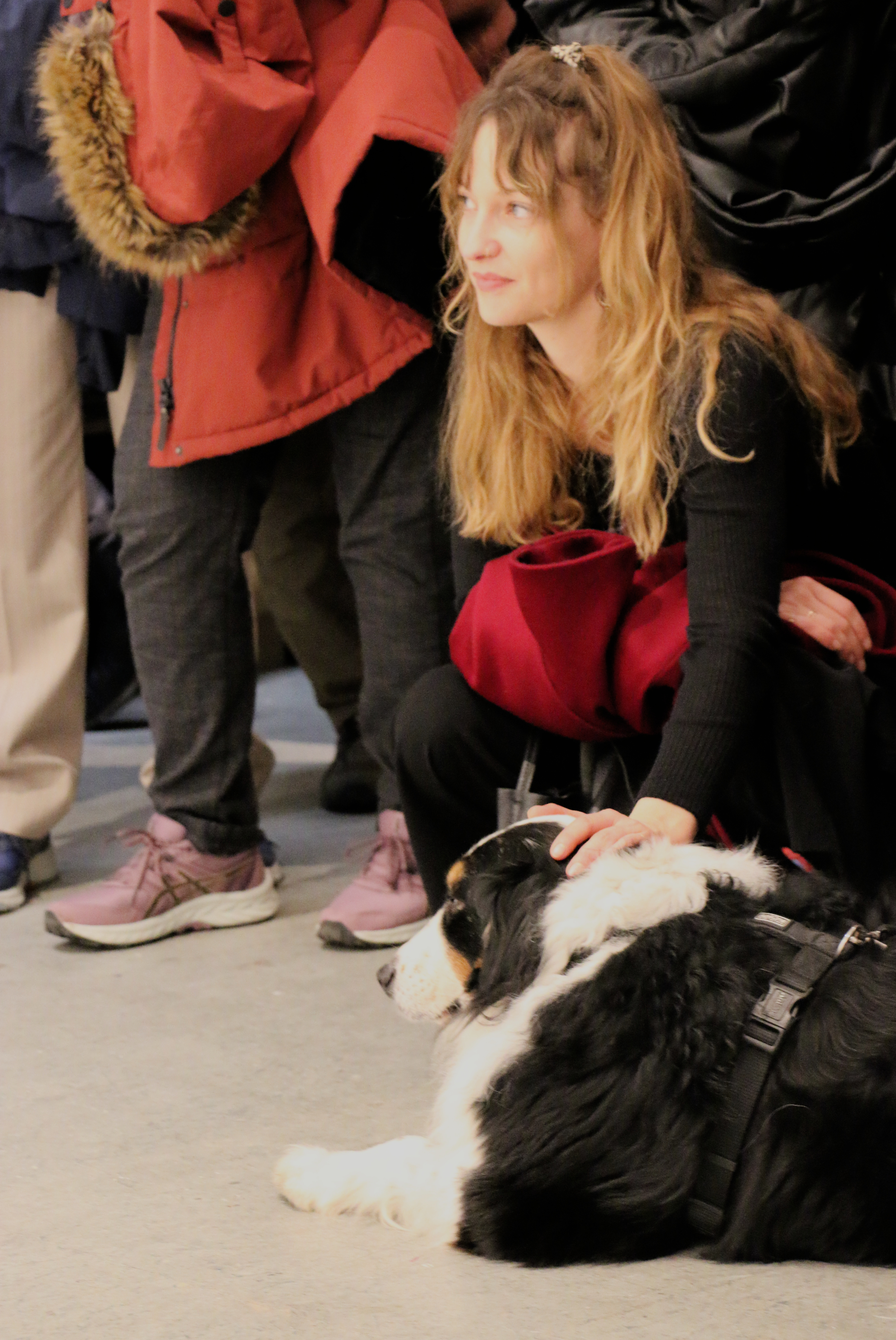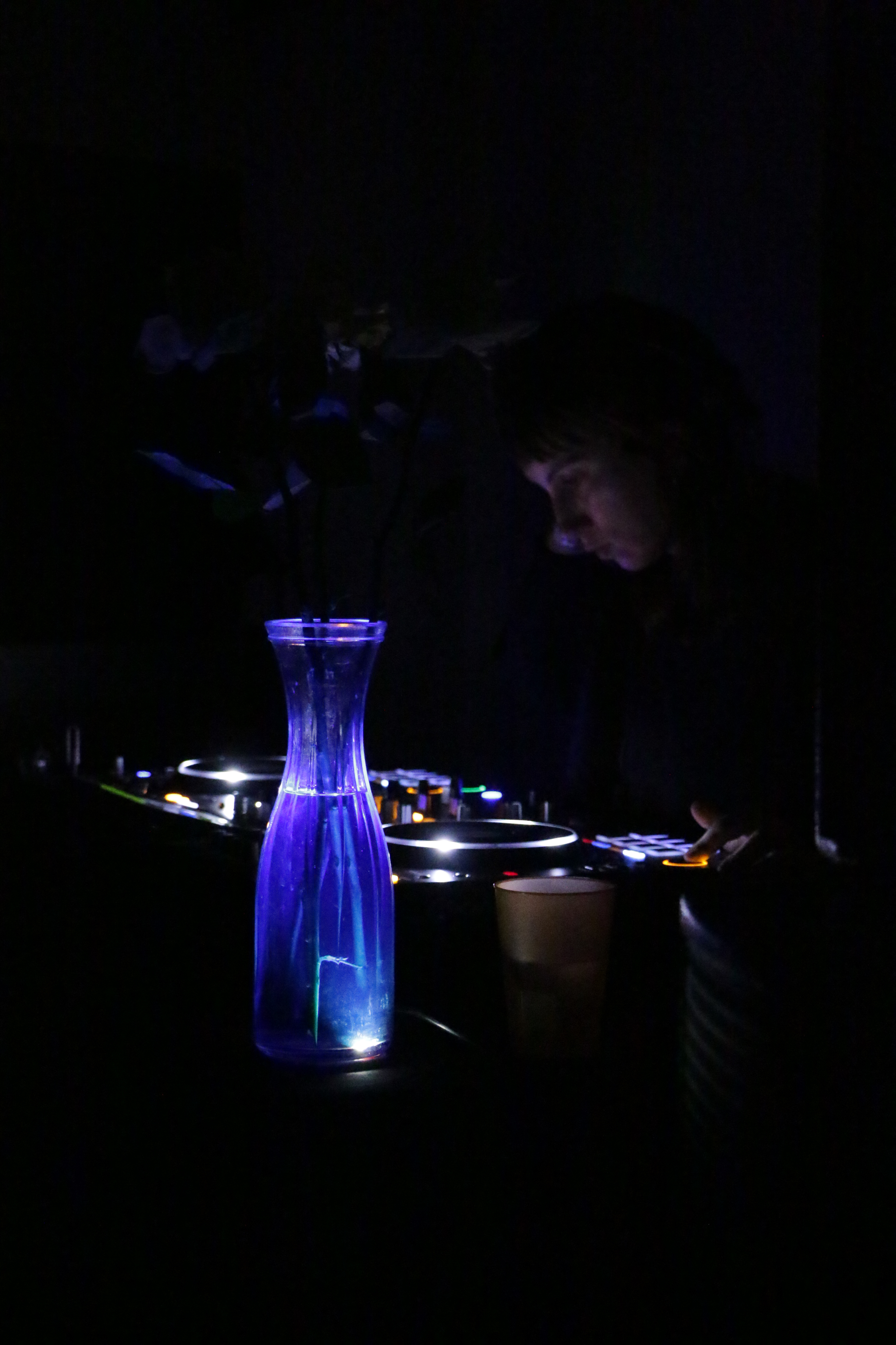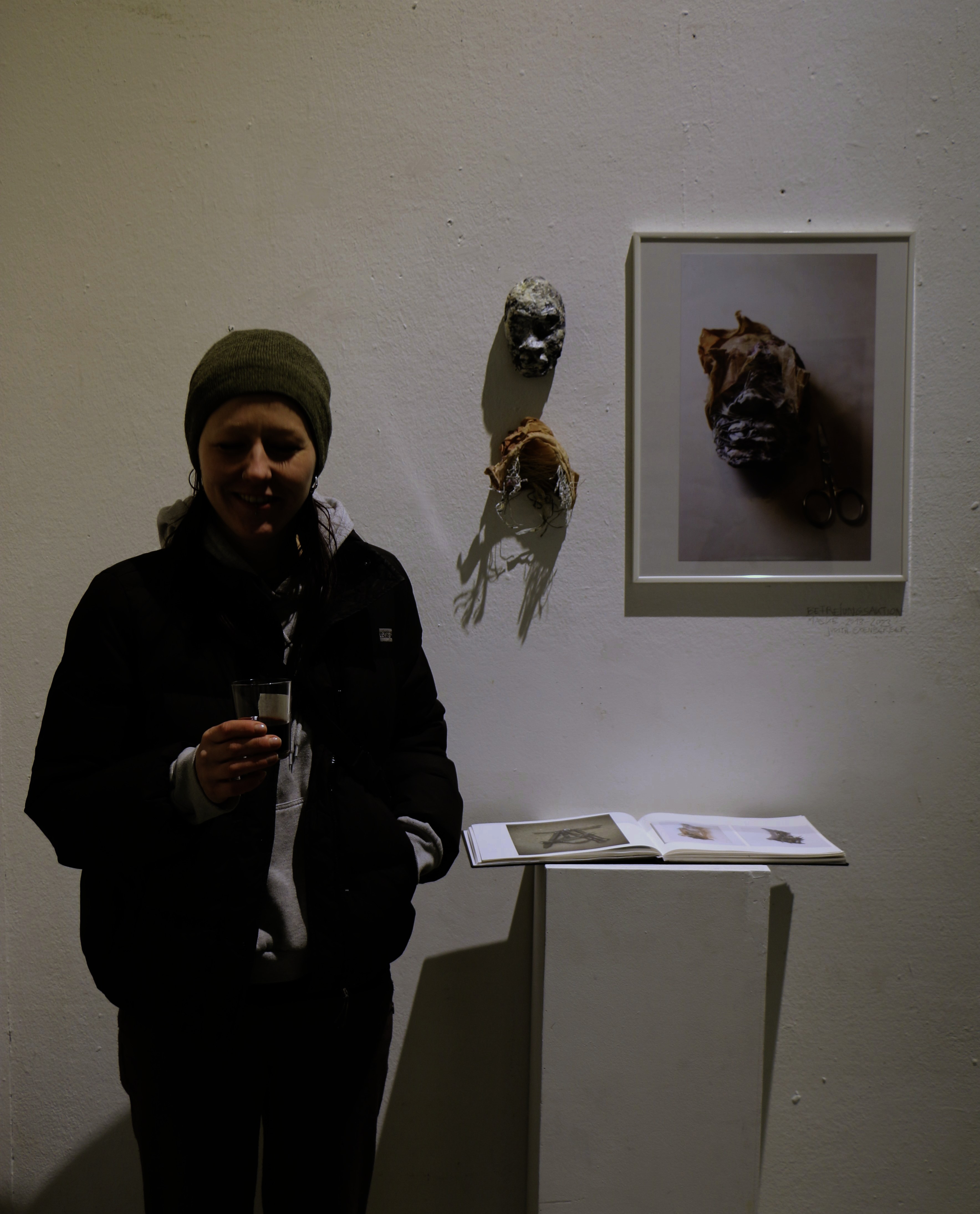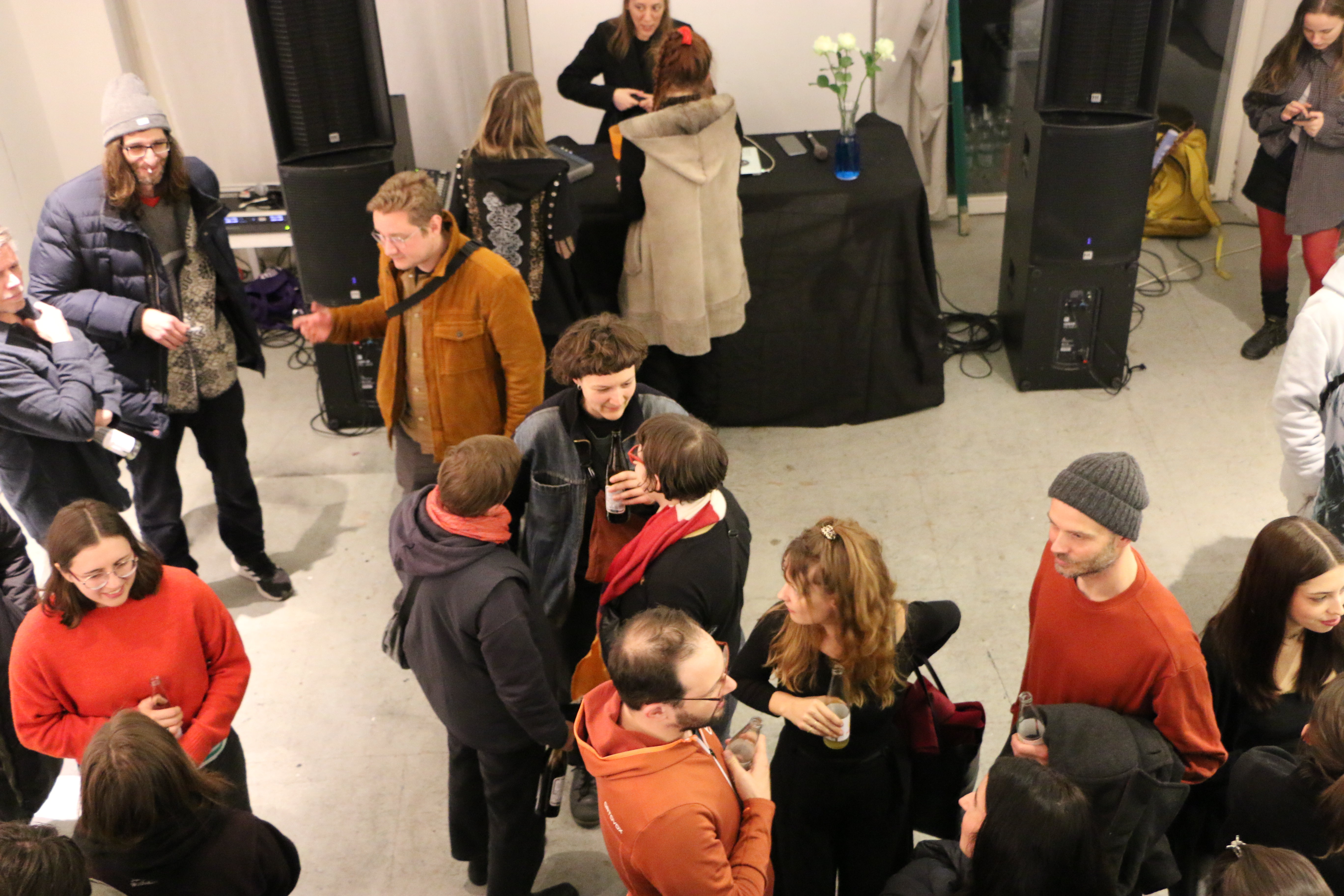 Nach einem gemeinsamen Streifzug durch die ausgestellten Werke zog Sofie Morin im Rahmen einer Lesung mit ihrer dichten, komplexen und tiefgründigen und – wie sie sie selbst beschreibt – phytopoetischen Lyrik das Publikum in den Bann. Im Anschluss verwob Anđelina Mićić als Zhe Pechorin das Publikum in atmosphärischen Klangteppichen, bevor Maya Auer als DJ Shyborg mit kontrastreichen und dynamischen Grime-Beats und Club-Sounds ausnahmslos alle Gäste in einen zweistündigen Tanzmodus versetzte. Danach ging es, durchgeschwitzt, wieder raus in die Kälte, mit vollen Herzen von den vielschichtigen Eindrücken des Abends, der in uns noch lange nachhallen wird.