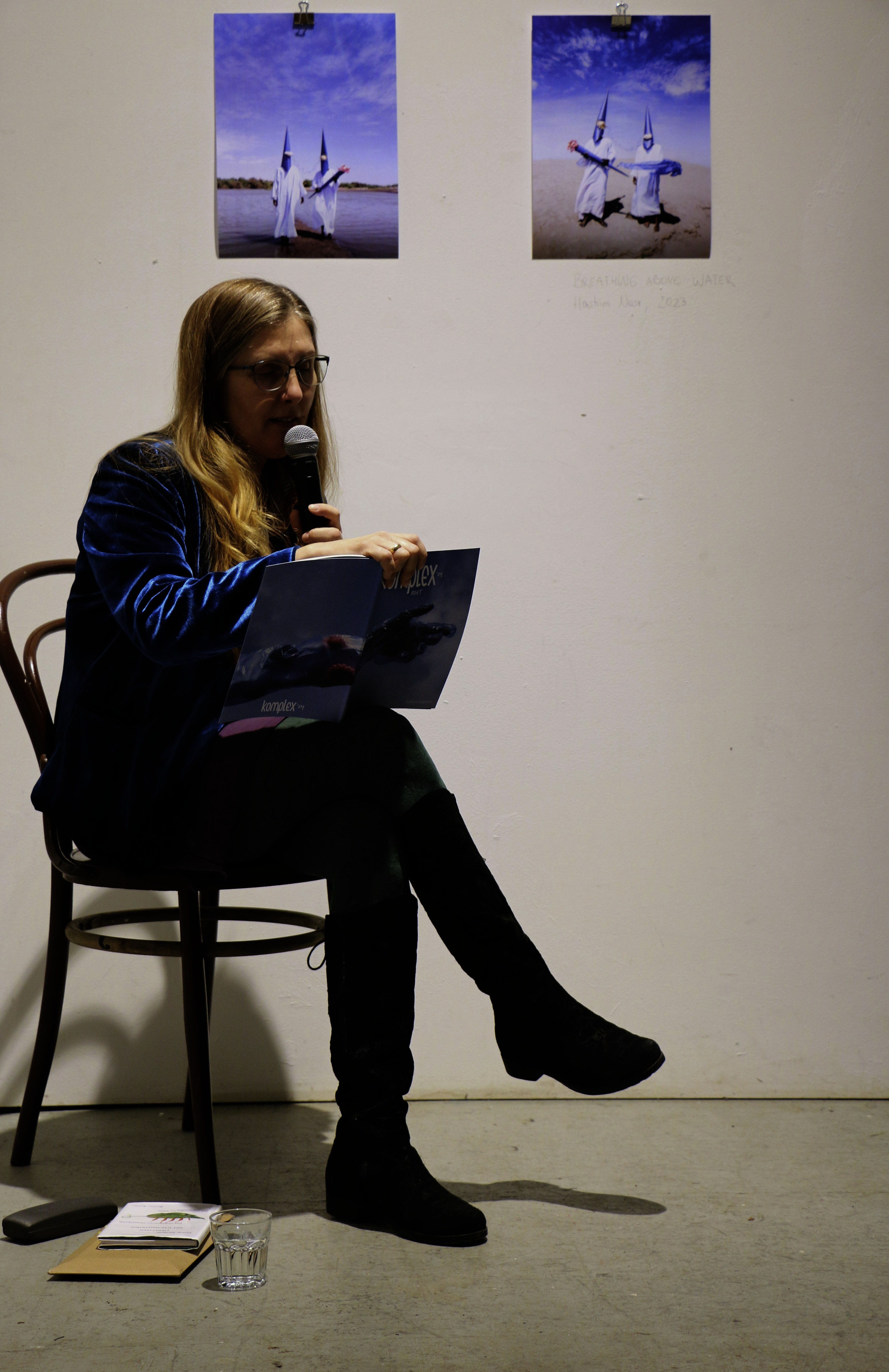 Himmelblau, azurblau oder doch kobaltblau? Wie auch immer die genaue Farbbezeichnung lauten mag: Es sind jedenfalls satte Farben, in denen das neue komPOST-Magazin 2024 erstrahlt – und so am Samstag passend zum Anlass zum Blickfang im Regal beim Eingang zum openspace.innsbruck wurde. An den Wänden links und rechts umrahmt von den Beiträgen einiger der Künstler:innen, die mit ihren Einsendungen zum Open Call „komPOST“ des vergangenen Jahres Teil des Magazins wurden – darunter Prints von Gemälden und Fotografien sowie Plastiken und eine filmische Projektion in Dauerschleife. Die Ausstellungen erzeugten sowohl für sich selbst eigene Welten zum Sich-Hingeben und Eintauchen als auch in der Gesamtschau einen immersiven Kunst-Raum, der während der Lesung zu neuen Gedanken anregte und durch die wechselnden Beleuchtungen während der musikalischen Einlagen in immer neues Licht getaucht wurden. So wurde die Releasefeier zum multimedialen und interdisziplinären Erlebnis.