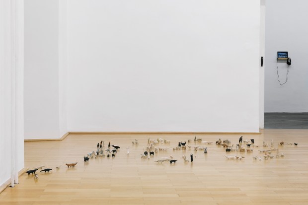 Wo bei Nicole Weniger die blauen Augen vom Gletscher herunterblicken, zieht sich ein feines Farbgespinst im selben Blauton über die im Wasser turnenden Figuren von Martina Moro, deren Material sich in der in nächster Nähe versammelten Herde kleiner Wesen von Juri Velt wiederfinden lässt. Der im Hintergrund stetig laut rauschende Fluss des Brunnens gibt den Wasserspuren auf den Bildern von Christina Kapeljuh eine noch intensivere Realität. Einzelne Werke wie Knoten im Gewebe des großen Ganzen also. Dann: ein Bruch. Wir betreten einen Raum, der von wattiger Stille durchzogen ist, das Licht wirkt bläulich, unnatürlich, befremdlich; eine endlose Bewölkung. Am Boden ein Gewirr aus Kabeln gleich einer Sammlung elektrischer Schlangen. Sonst: nichts. Bis der Ton beginnt. Anna Lerchbaumer fertigte für die Ausstellung eine akkustische Installation an, die den Raum mit einer körperlosen Roboterstimme füllt. Wo der Rest der Ausstellung stark mit der Natur und unserer Verbindung dazu befasst ist, setzt sich diese Künstlerin mit einem anderen Feld auseinander: dem digitalen Raum – jenem nämlich, in dem heute viele unserer Beziehungen zumindest teilweise stattfinden.