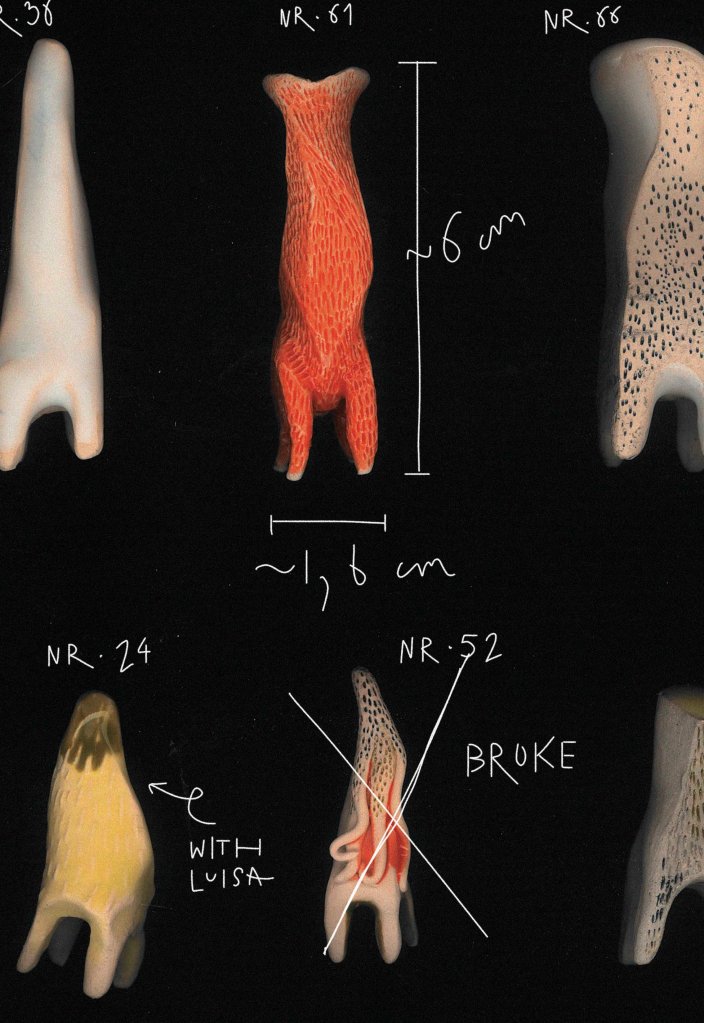 JV: Sie entstanden in einer Zeit, in der ich viel zu Themen rund um „otherness“/“Otherness“ (Andersartigkeit/das Andere) und über „making kin“ („sich zu vergeschwistern“/ “sich verwandt machen mit“) gelesen hab‘. Das war dann hauptsächlich komplizierte Theorie. Als Ausgleich habe ich begonnen, immer mehr mit Ton zu arbeiten. Ich mag das Unmittelbare daran. Und ich hab‘ schon das Gefühl, dass das, über das ich nachdenke, in die Formen reinfliesst — dann auch recht unmittelbar.