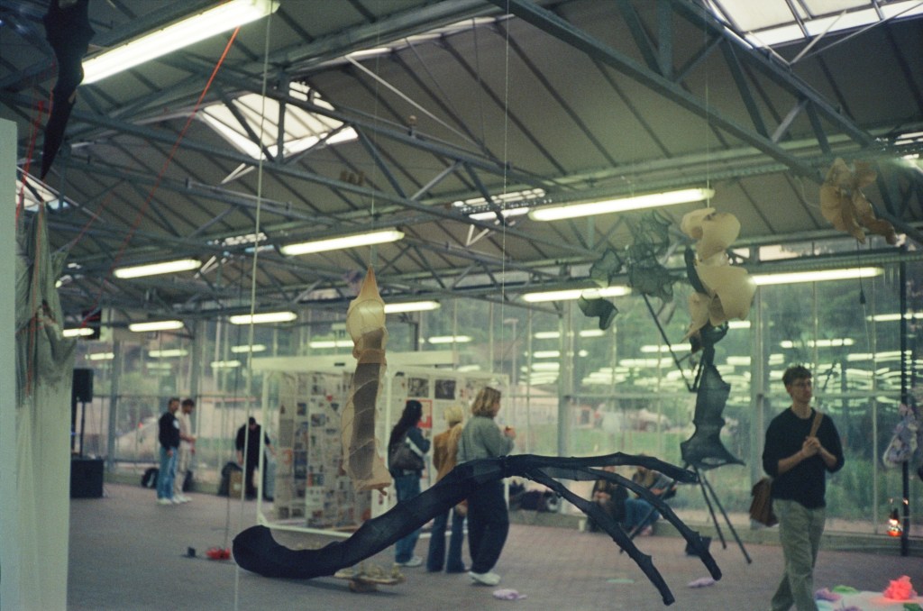 The exhibition space – a greenhouse – quietly, but confidently dictated its rules, furtherly completing the objects: transparent, breathable, suspending objects in their own ecology. Alongside the sculptures, linocuts functioned like contemporary ex librises – intimate self-portraits that tether the anonymous textile forms to their makers without revealing them. This tension between declaration and concealment gives the show its abstract, nearly ritual, very sacred sensation. A choreography of contrast and interconnection.