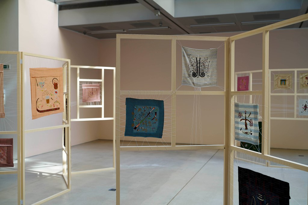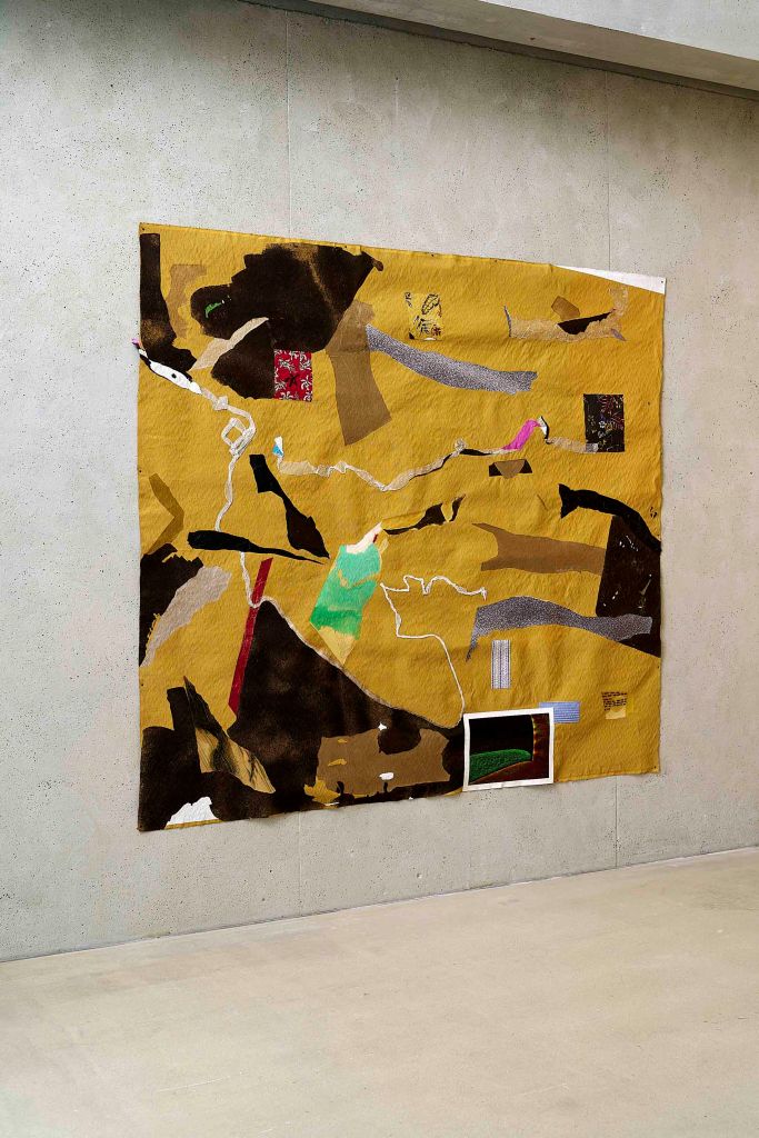 Auch Francis Offman erforscht in seinen Werken eigene Erfahrungen der Migration in der Kindheit und verbindet Kaffeesatz und Mullbinden mit altmeisterlichen Verfahren auf der Leinwand. Ähnlich wie Offman, der hauptsächlich auf gefundene oder ihm überlassene Materialien zurückgreift, verwendet Areez Katki für seine gestickte Zeichnungen Stoffreste seines Familienschneiders aus der Parsen Community. Mit Fäden auf ein Gerüst gespannt hängen die Bilder frei und durchlässig im Raum und verweisen mit kleinen bunten Elementen symbolhaft auf zusammenhängende Geschichten. Die gestickten Zeichnungen sollen kritisch Traditionen hinterfragen, seien aber auch eine Hommage an seine zoroastrische Kindheit.