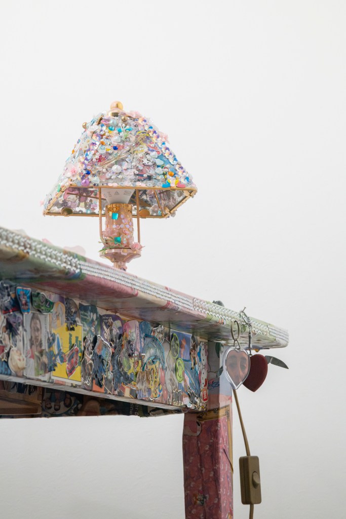 Die Motive in den Herzanhängern stammen alle aus meinem persönlichen Archiv – Dinge, die ich als Kind gesammelt habe oder die ich jetzt sammle. Manche habe ich extra ausgedruckt oder aus Büchern ausgeschnitten. Ich habe nichts davon eigens für die Installation angeschafft, alles stammt aus bestehendem Material. Ich arbeite generell viel mit Collage und gefundenen Materialien. Vieles stammt aus meinem großen Archiv – Fanartikel, Merch von Stars, Filmen, Modezeitschriften. Es geht immer auch um eine Idee von Fantasie, um einen Idealzustand.