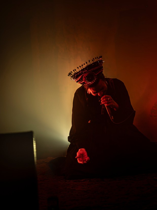 Als nächstes übernehmen die drei Finn:innen von Muovipussi die Bühne. Eine Show, die im Booklet als „Rap, Crispy Pop und Metal“ beschrieben wird, aber nicht wirklich mit irgendetwas zu vergleichen ist, das ich schon einmal gesehen habe: Tanzmusik mit Remixes von Kotzgeräuschen trifft auf Metal-Vocals, eine Handtasche, die mysteriöse Geräusche ausstößt und seltsame Akrobatikübungen (der Synthesizer wird mit einem Fuß hinter dem Kopf bedient). Mitten im Konzert wird eine der Performer:innen von den anderen beiden spontan ausrangiert, das heißt: weggetragen und auf den Boden im hinteren Bereich der Bühne gelegt. Eine Decke wird über sie gebreitet, das Konzert geht zu zweit weiter. Zwei Lieder später entspringt sie ihrer Ecke wieder, jetzt mit Corpse Paint, die sie sich anscheinend unter der Decke liegend selbst aufgemalt hat. Während dem Konzert gibt es auch andere aufregende Outfitmomente: unter schwarzen Müllsäcken, als Kleider drapiert, kommt an der einen ein rot schillerndes Paillettenkleid zum Vorschein, während die andere zwei Plastikmasken enthüllt, die von ihrem Oberkörper baumeln und mit ihren offenen Mündern ein endloses Jammern auszustoßen scheinen. Eingepackt von diesen gummigen Busenmännern wird sie anschließend auf Schultern singend durch die Halle getragen. Das Ganze hat etwas von einem grotesken Gottesdienst. Mitten im clownesken Spektakel beschreibt eine der Künstler:innen eine Erinnerung. Eine Lehrerin, die ihr schon früh ihre eigensinnige Art und ihren unkonventionellen Geschmack austreiben wollte: „What would that teacher say if she saw me here today? Well, I don’t know, because she’s not here. I am.“