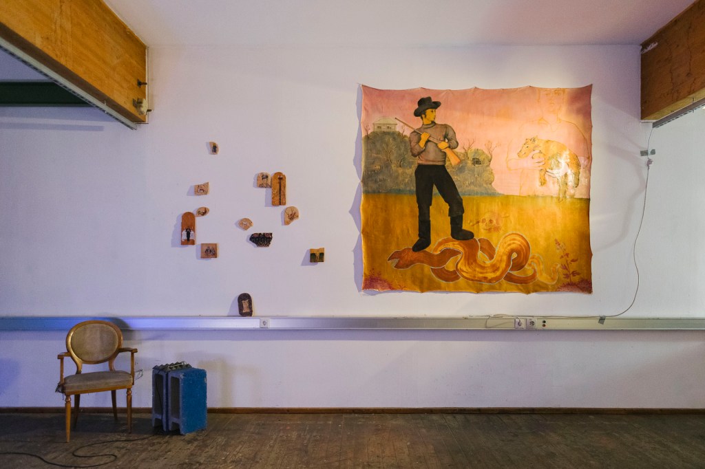 Auffällig und zufällig durch die Zusammensetzung der Beiträge präsent war auch das Thema Tier, Wildnis und Jagd. Im Raum begegnete man Schaumstoff-Tierattrappen, die Teil des Videoprojekts Playground von Oksana Pohrebennyk waren. Ein Frischling schien sich beinahe unauffällig im Raum zu verstecken, während ein auf Felsgrund drapierter Fuchs die Gäste bereits am Eingang begrüßte. Auch im großformatigen Gemälde von Gergő Bánkúti war die Wildnis und Jagd als erinnerter oder verklärter (oder verlorener?) Ort präsent. Diese wiederkehrenden Motive verwandelten den Raum noch einmal mehr in eine immersive Erfahrungslandschaft.