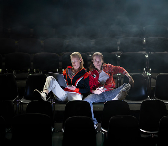 Das Bühnenbild zeigt eine etwas abgerockte WG-Wohnküche – ein Zuhause, die eigenen vier Wände. Jener Ort, an dem wir die meiste Zeit damit verbringen, Medien aller Art zu konsumieren. Hier erzählen und konsumieren die beiden Schauspielerinnen folglich mit und für uns die Geschichten von Em, Ike und Kay sowie Laila. Abgerockt auch deshalb, weil wir uns sowohl im ehemaligen Weekender/Utopia als auch in einer Student:innenstadt befinden. Es soll also nicht der Eindruck entstehen, dass es „uns“ nicht betrifft, sondern im Gegenteil – die beiden Darstellerinnen repräsentieren zwei intelligente Figuren, Vertreter:innen des urbanen Raums. Zugleich ist die Bühne aber auch als Artefakt erkennbar und will nicht die Illusion einer „echten“ Wohnküche erzeugen. Wir befinden uns schließlich in einem Theater, und es sitzt Publikum vor uns.
