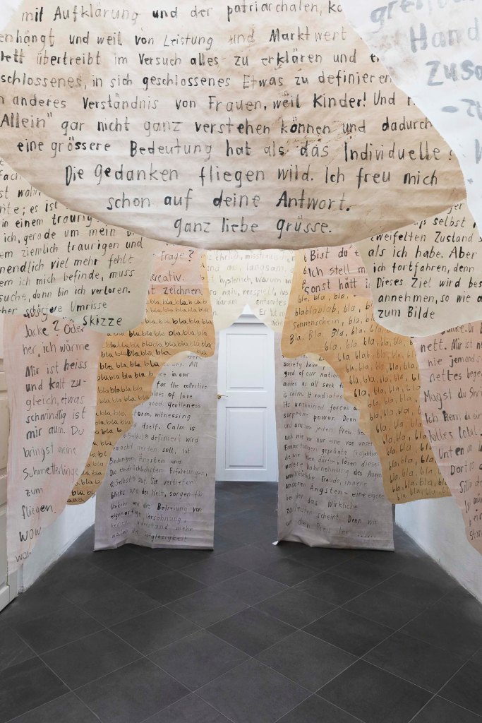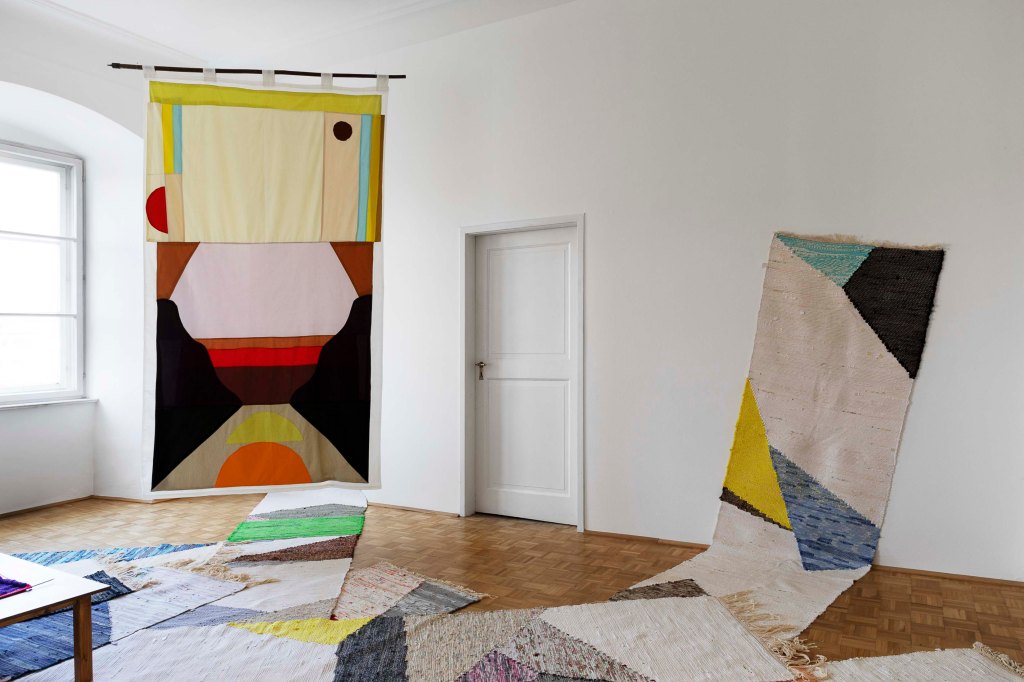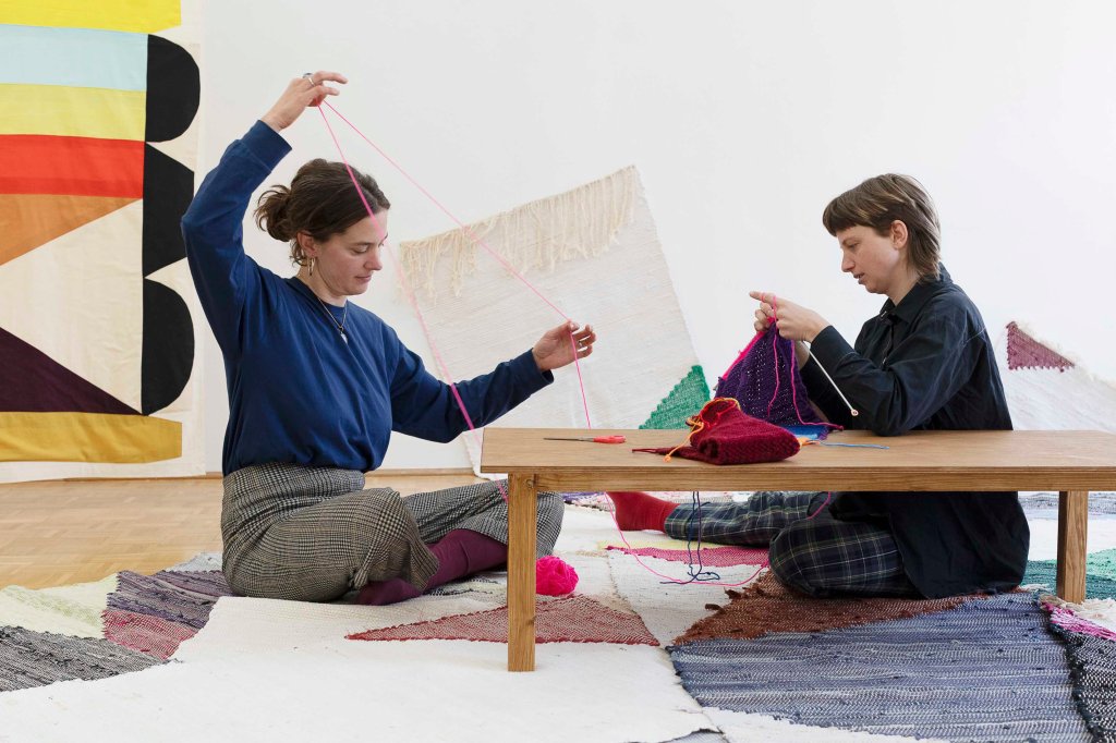 Die Ausstellung „Flirt“ könnte man auch als erste Annäherung begreifen, in der zwei in Innsbruck lebende Künstlerinnen den Versuch starten, ihre Arbeiten in Bezug zu setzen. Die gemeinsamen Themen sind ein philosophisches Hinterfragen der eigenen Identität und der Umwelt und die Auseinandersetzung mit weiblichen Rollenbildern und Erwartungshaltungen im Alltag von Frauen, denen man sich auch als Künstlerin nicht entziehen kann – das zeigt sich etwa in einem Raum mit gewebten Teppichen von Abendstein am Boden und angefangen Strickarbeiten, die so demonstrativ bereitstehen, als wäre das Publikum dazu angehalten, hier weiterzuarbeiten – zur klassischen Musik aus dem Ö1-Radioprogramm und mit Blick auf die Stoffbanner von Peterhans. Der heutige erneut aufflammende Trend zur Handarbeit wird in „Flirt“ aber nicht mit einer konservativen Häuslichkeit assoziiert, sondern als kollektive künstlerische und feministische Praxis präsentiert. Die Rauminstallation zeige das „Zuhause als Ort der (Selbst)begegnung und lasse sich kritisch als Kommentar auf eine Gesellschaft verstehen, „in der Menschen in einem Zustand innerer Abgekoppeltheit leben – von sich selbst, von der Natur und vom sozialen Gefüge.“ So lautet die Beschreibung im Pressetext.