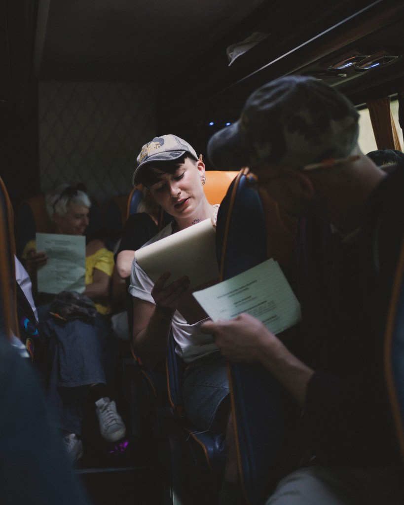 Herlihys „Beyond Survival School Bus“-Tour ist angelehnt an die Dramaturgie von Reality TV-„Survival-Sendungen“ und alle Teilnehmer:innen bekommen von Ranger Herlihy eine Rolle zugeteilt. „Etwas, das bei Performances oft passiert, ist dass sie als Unterhaltung wahrgenommen werden“, beschreibt Herlihy, die dieses Konzept umdrehen will und das Publikum glauben lasse, es werde unterhalten, während es tatsächlich in die Handlung mit reingezogen wird. Diese 90-minütige Bustour hat die Künstlerin 2022 entwickelt und leicht adaptiert. „Im Grunde geht es um Durchhaltevermögen, die Fähigkeit, auf unterschiedliche Weise zu existieren und aufzublühen.“